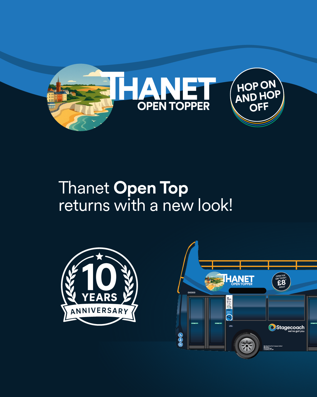 Thanet Open Top Day Tickets are £8 for adults and £5 for under 19s and concessions. A Group Ticket can also be purchased at £22 for up to 5 people and under 5s travel free. Thanet Open Top Day Tickets allow unlimited hop-on, hop-off all day and are valid on all Stagecoach buses within the Thanet DayRider zone. For full fare info, please click here