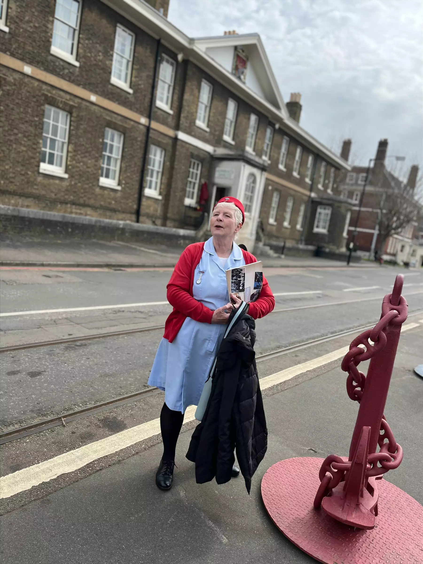 We met our dedicated Call the Midwife guide outside the impressive looking HMS Cavalier. We knew exactly who she was from the very distinctive red cardigan and beret that has become synonymous with the hit BBC TV series.
