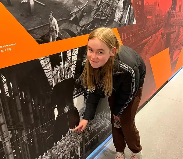 Our first stop was to the Steam, Steel and Submarines Exhibition, looking for any family relics. We were delighted to discover a large image of HMS Ocelot ready and waiting for its maiden voyage alongside all its workers, and right there in the middle of the photograph was my late father. A proud moment for me and his doting granddaughter.
