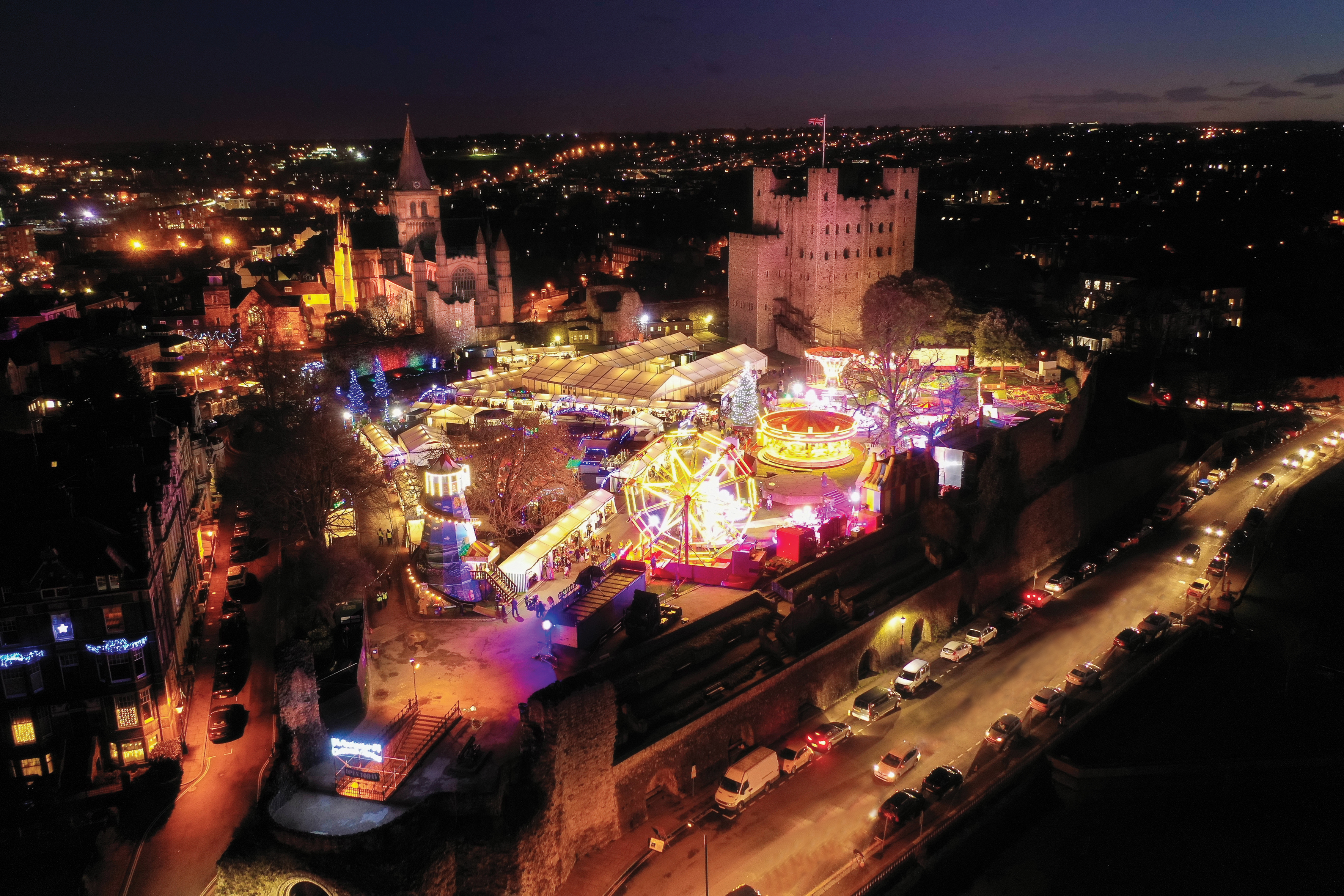 An overhead image of the Rochester Christmas Market and the illuminated lights surrounding the Castle grounds.