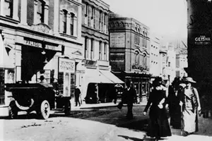 Chatham High Street (West) in 1901. The view is looking east with The Globe Hotel in the distance. he Theatre Royal and Manor Road are to the right.