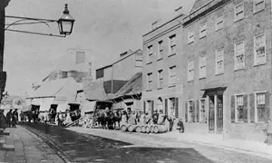 Employees of Biggs Brewery on the north side of Strood High Street on a lovely sunny day. Outside the building with beer barrels and horses and wagons waiting in line to be loaded/unloaded. The tower of St Nicholas Church is visible in the background.